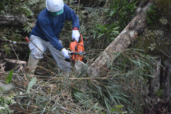チェーンソーは森の空気をつんざくような高音をあげながら、次々と樹木を伐採していった。=2016年、沖縄高江ヘリパッド建設現場 撮影:田中龍作=