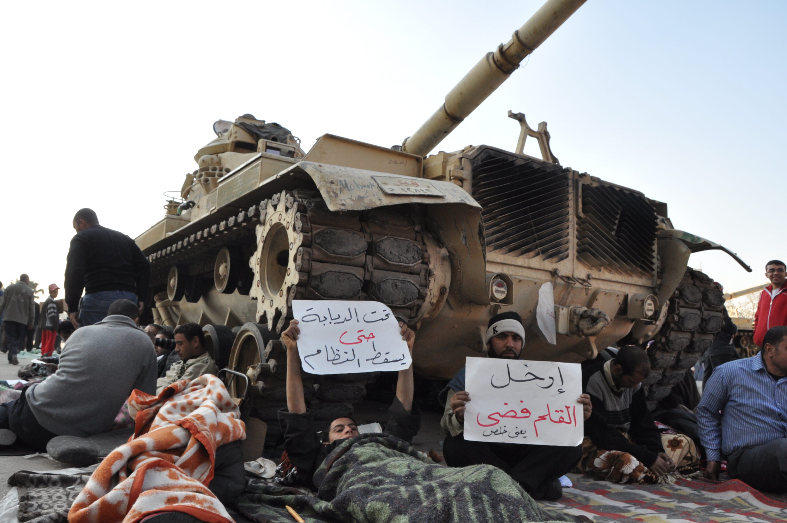 30年以上続くムバラク独裁政権を倒すまで、人々は座り込みを解かない構えだ。戦車が広場の中に配置されていた。ムバラク大統領は軍出身である。