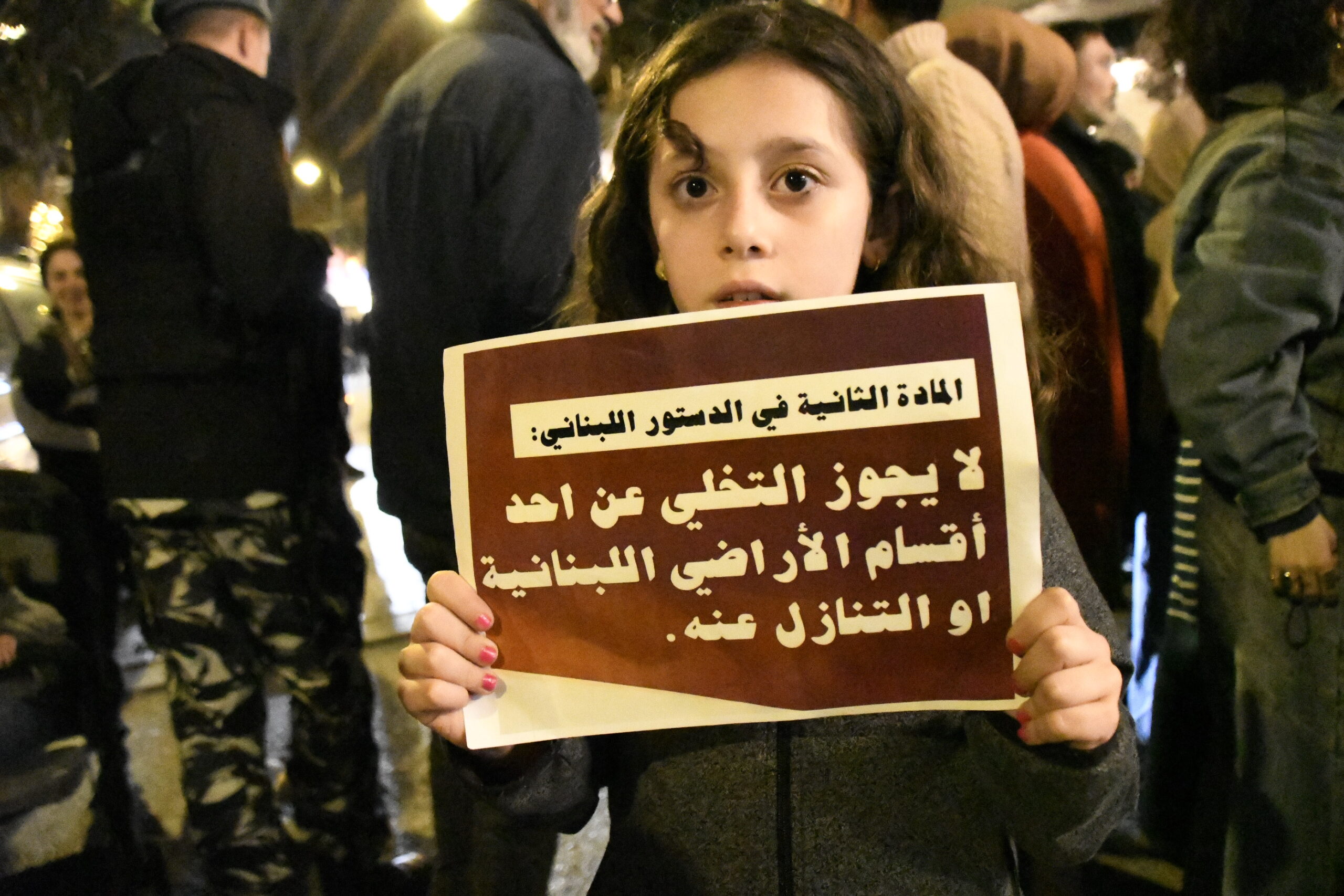 小さな女の子が「レバノン領土のいかなる部分も放棄されてはならない」と書いたプラカードを持って街頭に繰り出しているのだ。親から持たされたのだろうが。