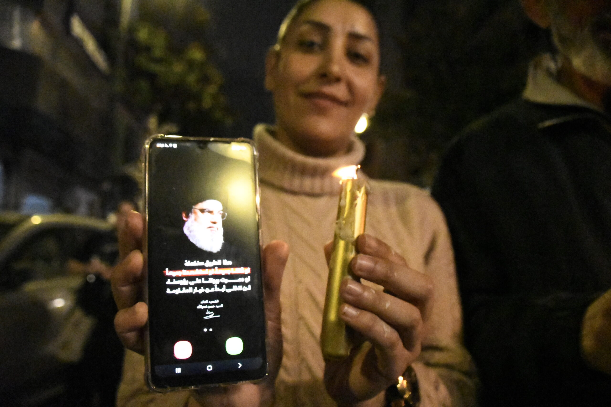 スマホにはナスラッラー師の遺影が。=日本時間28日午前2時頃、ベイルート中心部 撮影:田中龍作=
