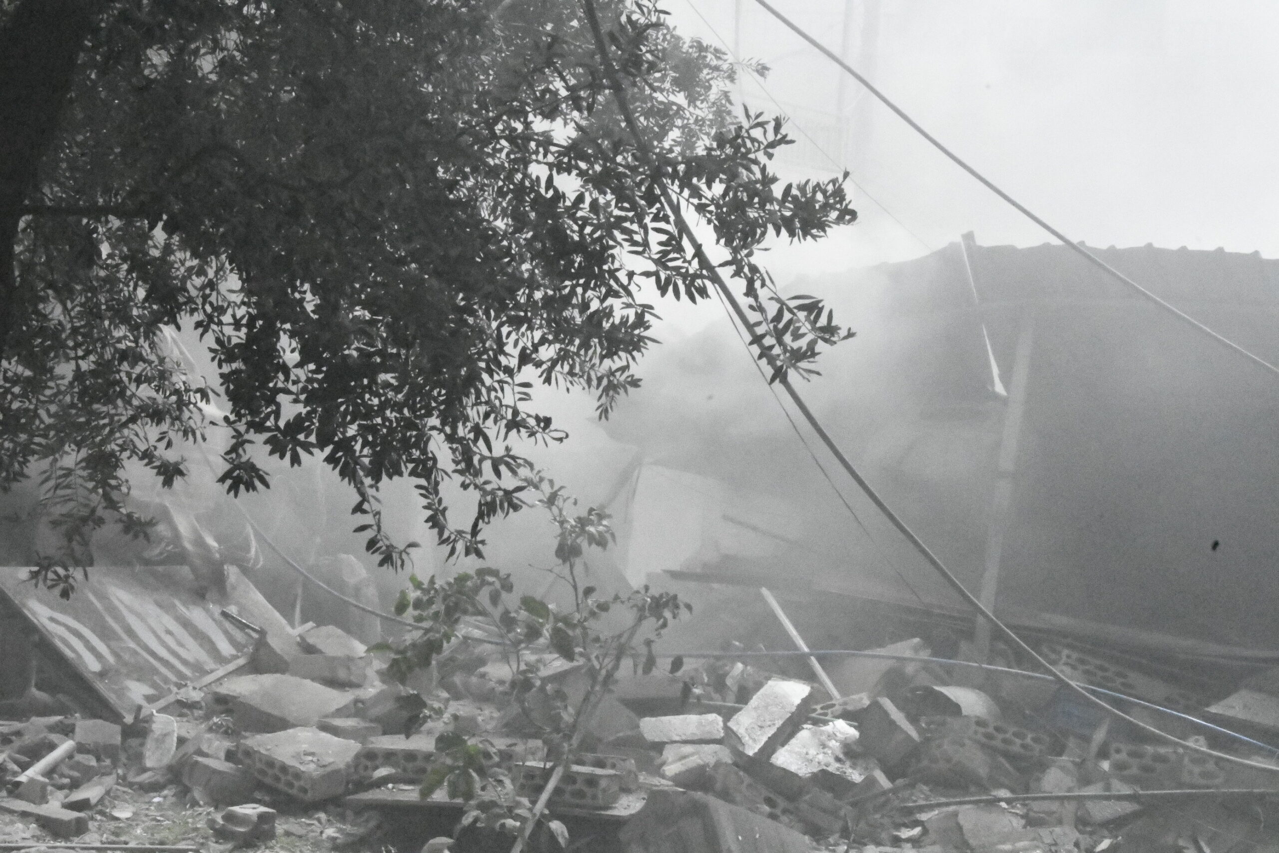 ラフィック・ハリーリ病院の前の住宅も爆撃された。田中が現場に着いた時は、熱い煙が立ち込めていた。防塵マスクを着用した救急隊員たちが、生存者の捜索と救出にあたっている。