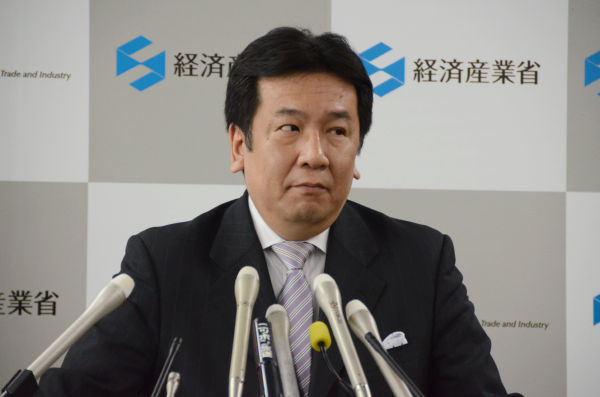 「ベントフィルターや防潮堤が完成する前に津波や大地震があったら、どうするのか?」と問われ憮然とする枝野大臣。=6日午前、経産省。撮影:諏訪 京=