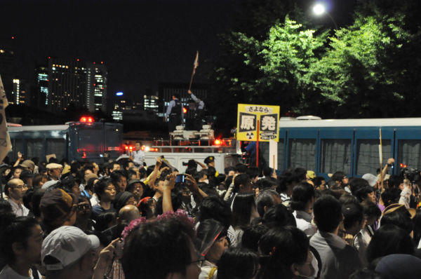 官邸正門前に横付けされた機動隊車両。子供を肩車した父親の姿も。=写真:田中撮影=