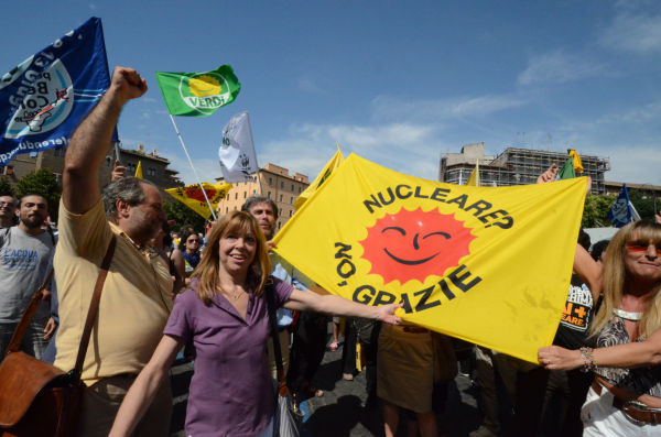 「原発ノーサンキューの旗を掲げて歓声をあげるローマ市民。(13日午後3時40分ごろ、「真実の口」前広場。 写真:筆者撮影)
