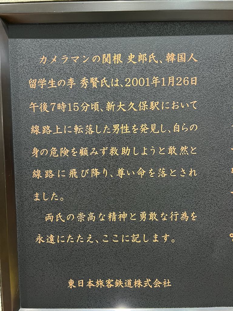 韓国人留学生と日本人カメラマンの勇気をたたえたレリーフ。=JR大久保駅構内 撮影:田中龍作=