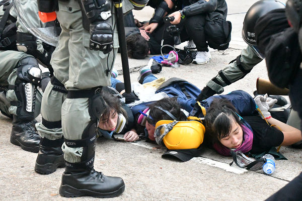 普通選挙を求めて警察に拘束されたデモ参加者。=2019年、香港 撮影:田中龍作=