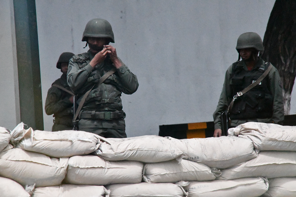 土のうと軍隊に守られた大統領公邸。どこが民主主義国家なのか?=2019年、カラカス 撮影:田中龍作=