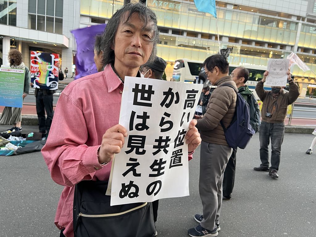 高市=「高い位置」。その通りだ。=3日夕、新宿南口 撮影:田中龍作=