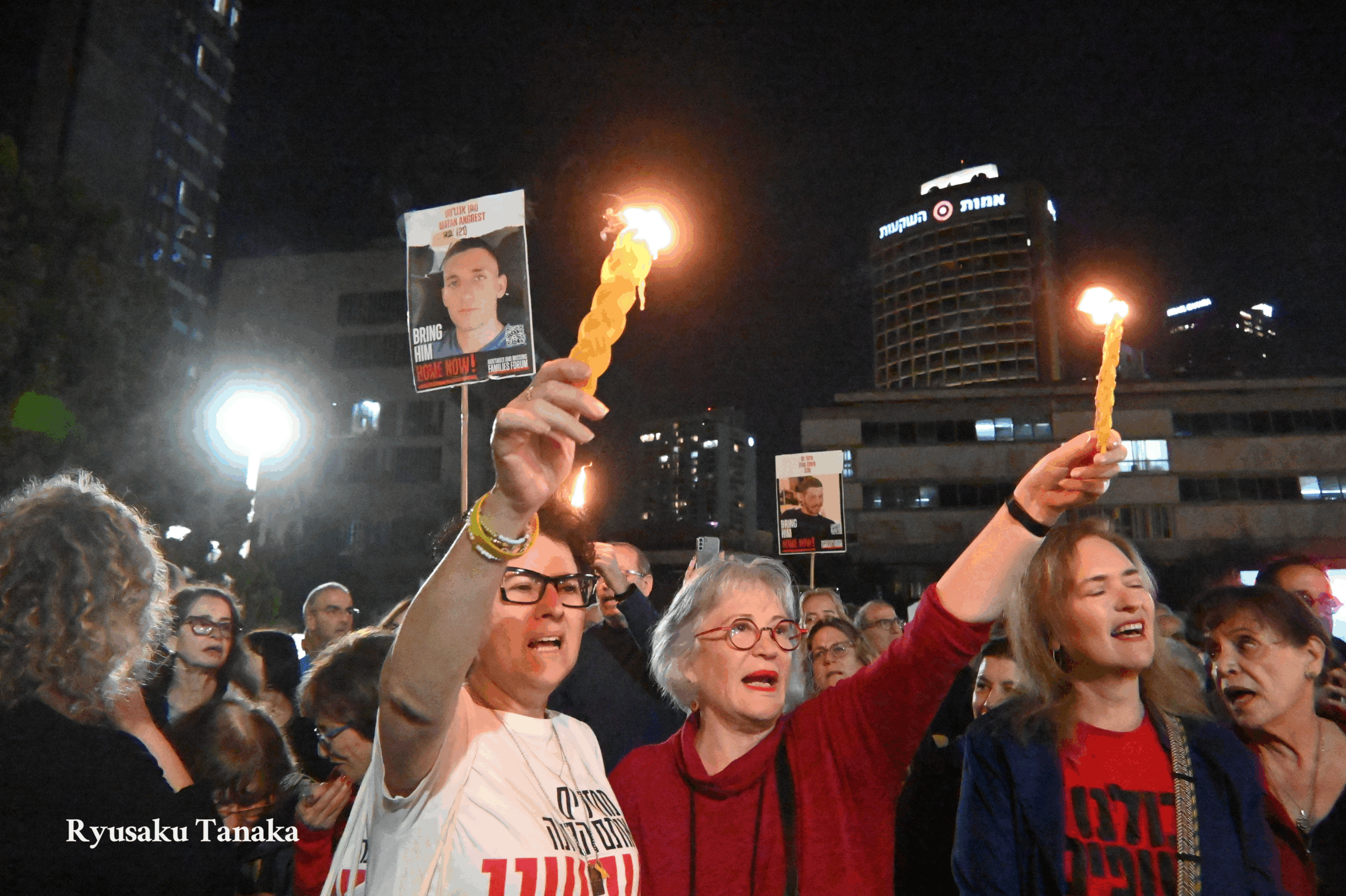 人質奪還集会。家族は怖くてネタニヤフを批判できない。批判すれば報復で人質奪還を遅らせたりされるからだ。=3月、テルアビブ 撮影:田中龍作=