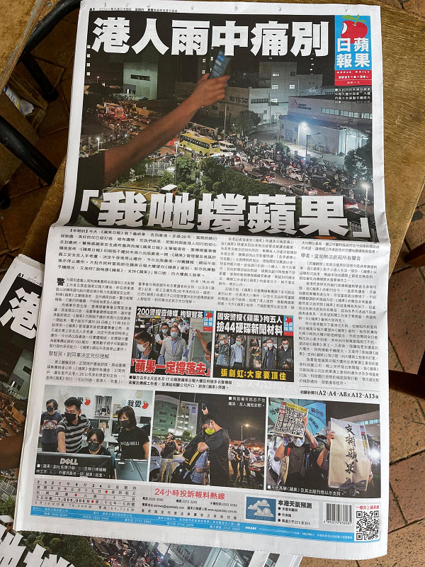 中国政府の弾圧により廃刊に追い込まれた『りんご日報』の最終版(2021年6月24日)。=撮影:香港の友人黎氏=