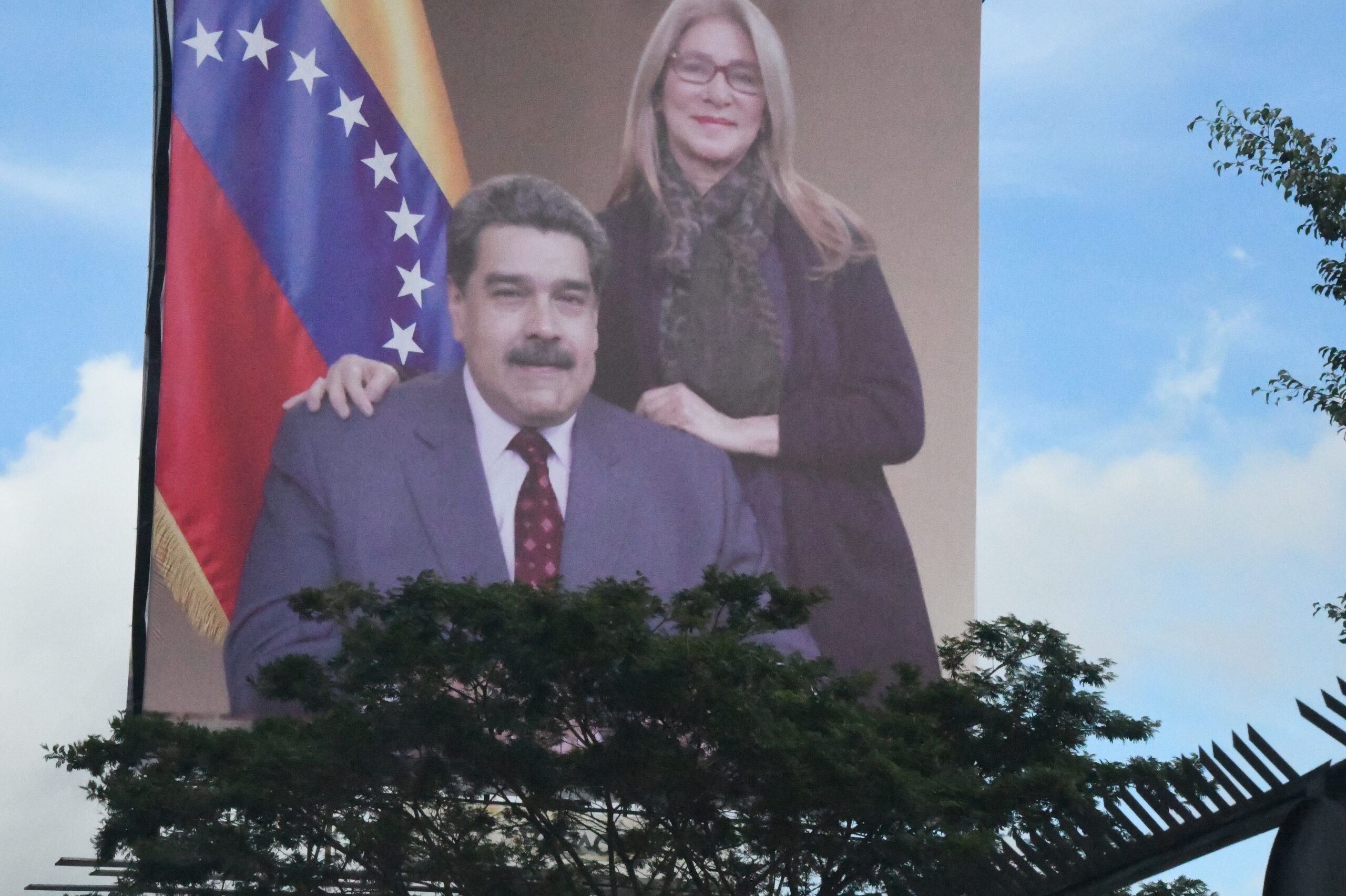 マドゥロ大統領夫妻の巨大な写真垂れ幕が空軍基地のすぐ傍で威光を放っていた。=16日、カラカス市内 撮影:田中龍作=