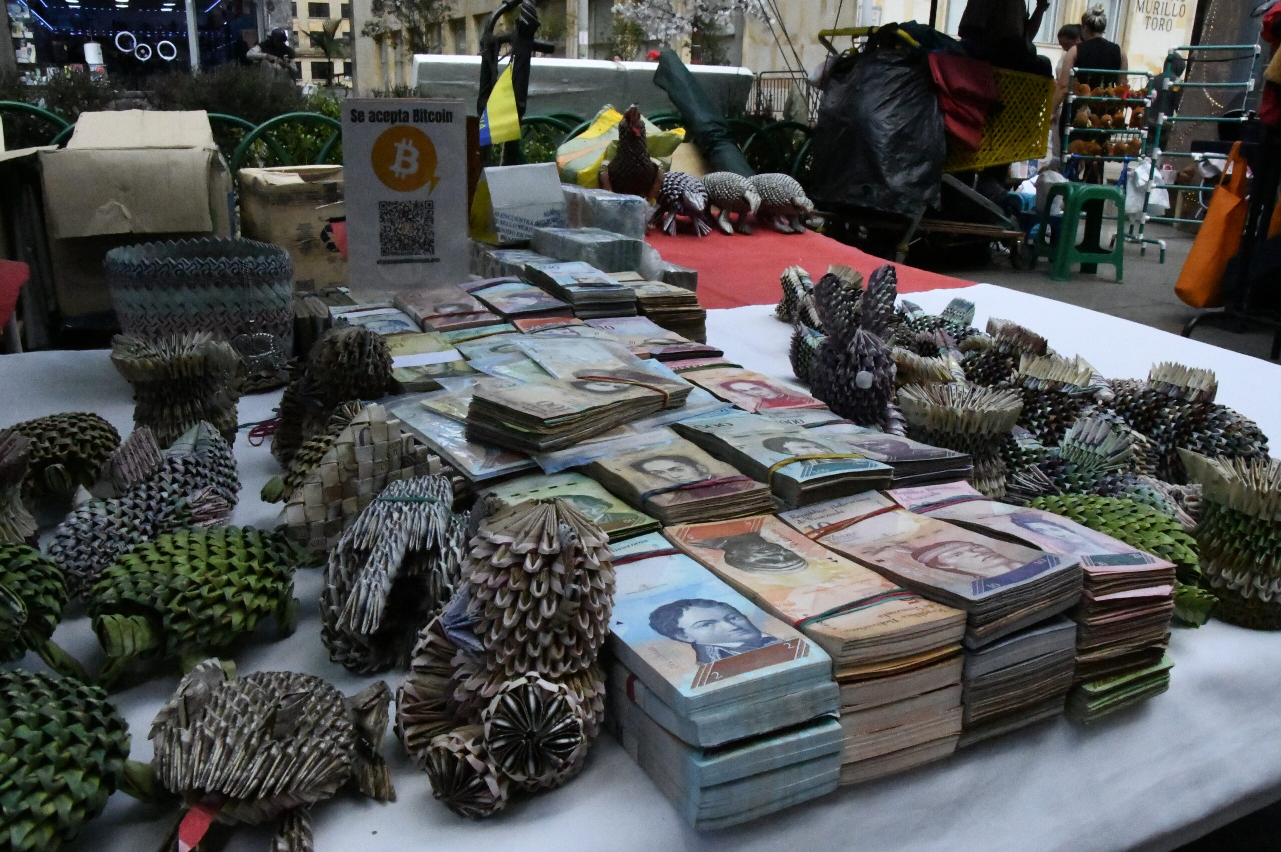 独裁者マドゥロ大統領のバカげた経済政策で紙屑となったベネズエラ紙幣。=11日、ボゴタ市内 撮影:田中龍作=