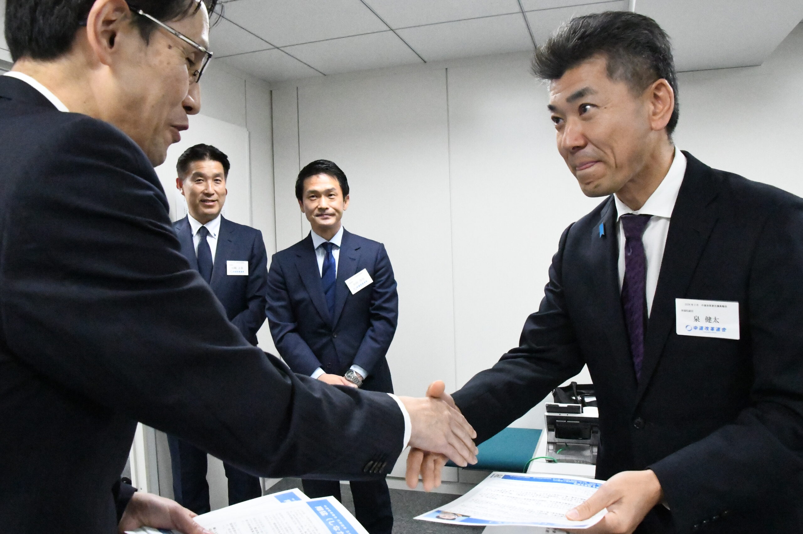 小川新代表だけが元気一杯。斉藤・野田両前共同代表の疲れた表情が印象的だった。=13日、立憲党本部 撮影:田中龍作=
