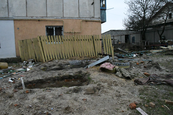 ロシア兵が食料を強奪した家屋のすぐ傍には、人を埋めた跡があった。=2022年、ボロデャンカ 撮影:田中龍作=