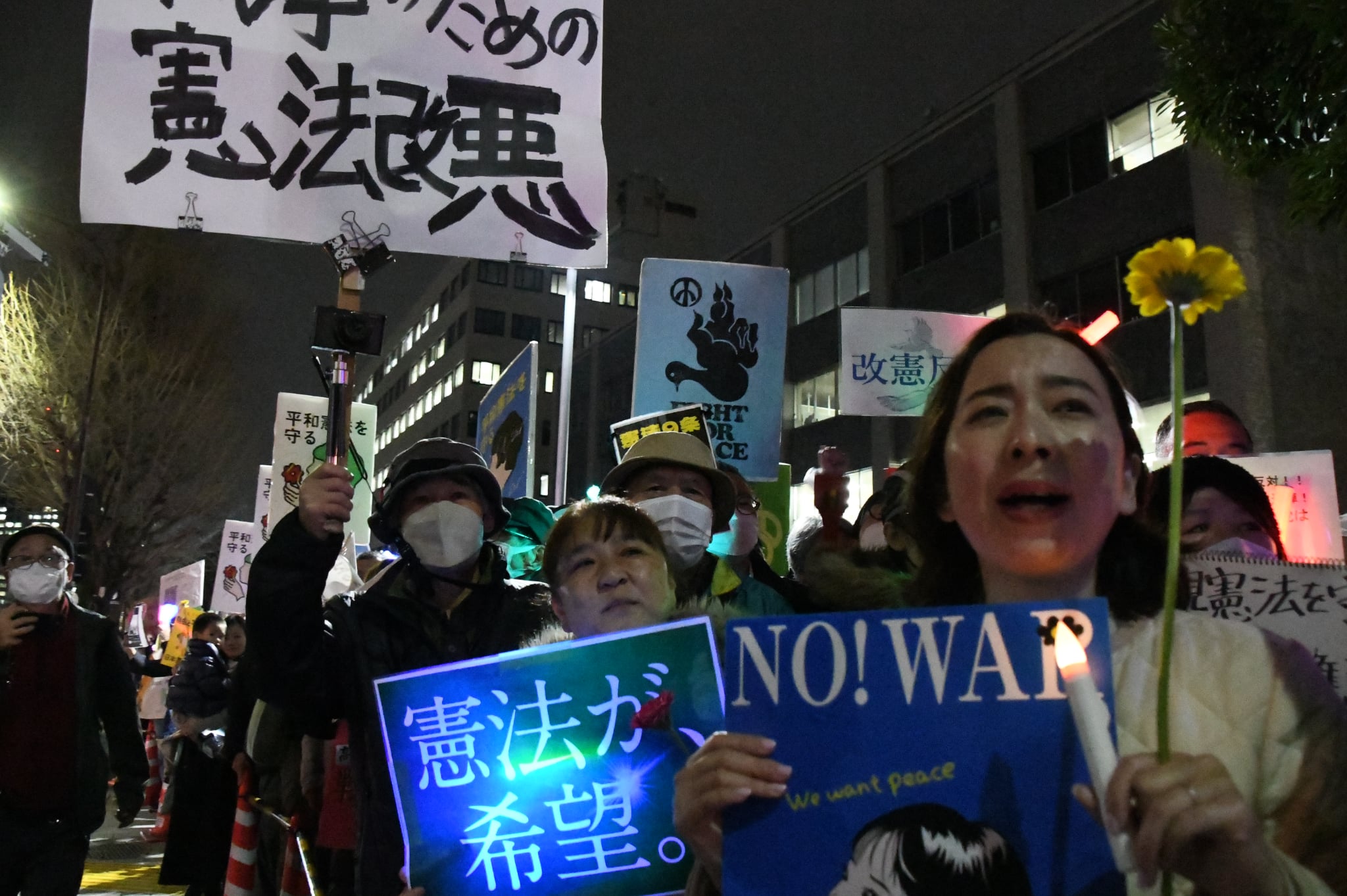 「自民も維新も憲法触るな」「改憲反対」…公邸住まいの高市首相の耳にはどのように響いただろうか。=27日夜、官邸前 撮影:田中龍作=