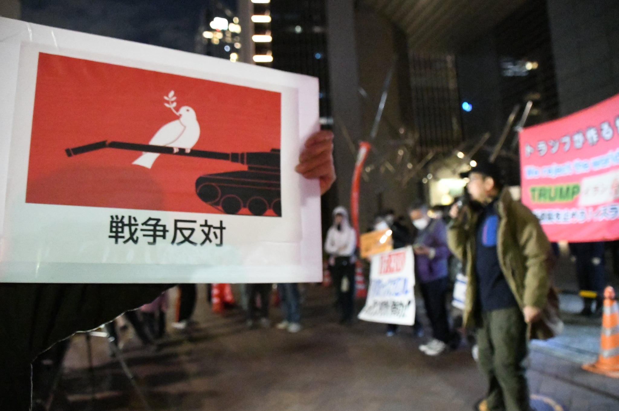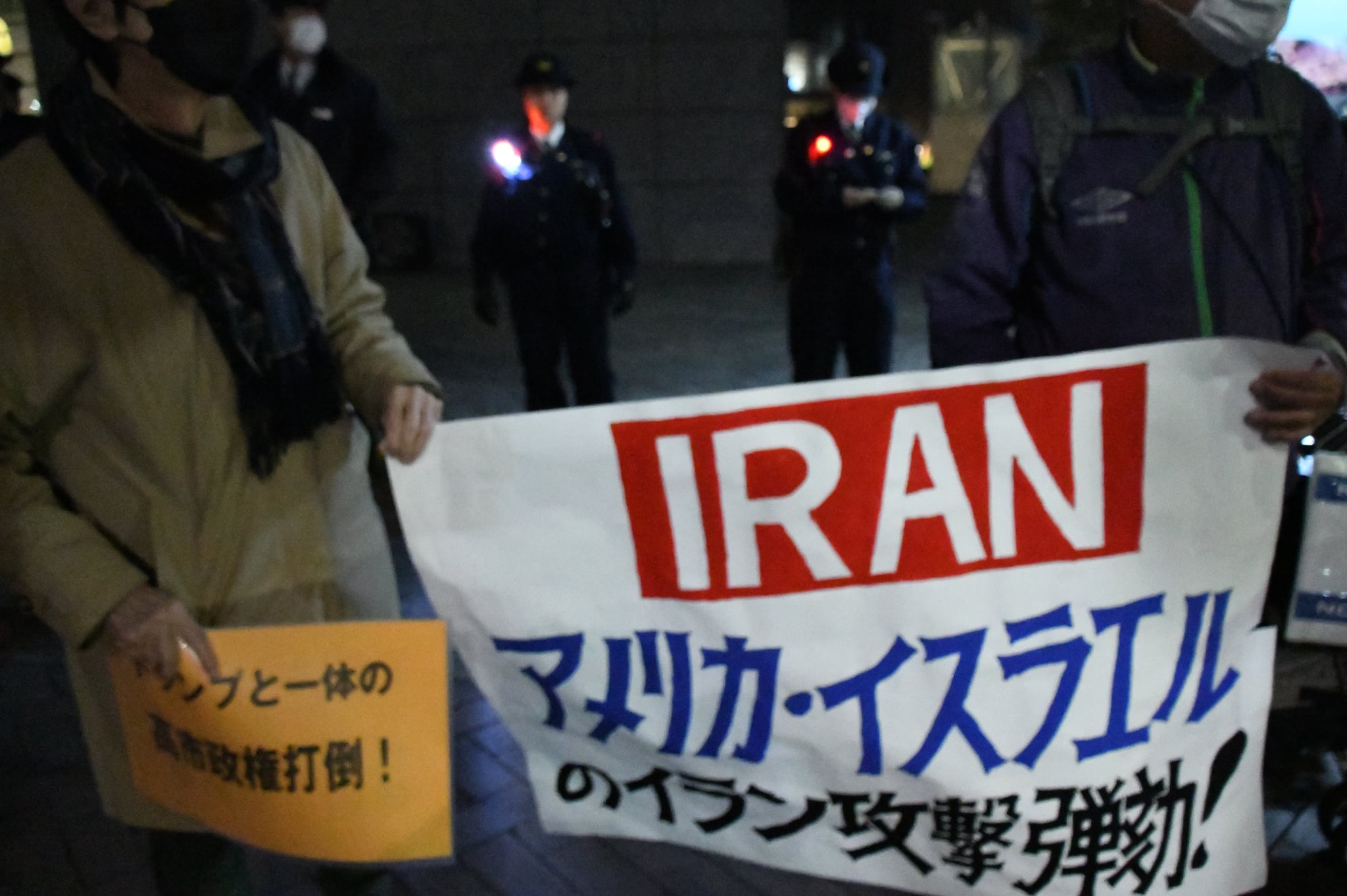 米国大使館近くで、市民たちは「イスラエルと米国によるイラン攻撃反対」の声をあげた。=1日夕、虎ノ門 撮影:田中龍作=