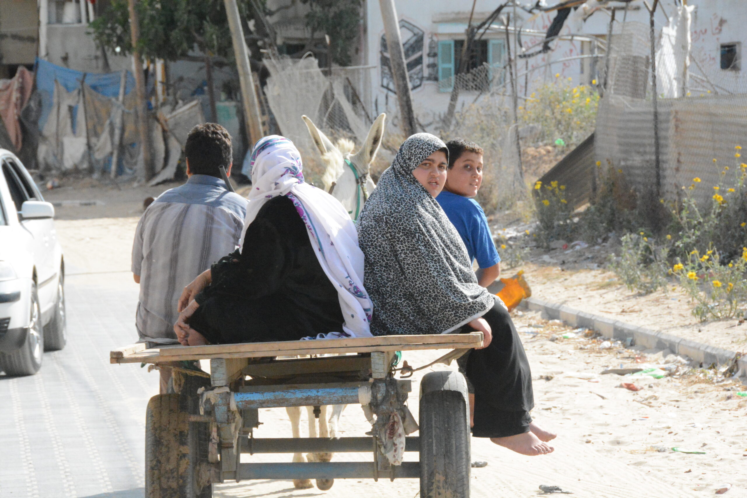 爆撃を逃れるためロバで避難する家族。=2014年、ガザ 撮影:田中龍作=