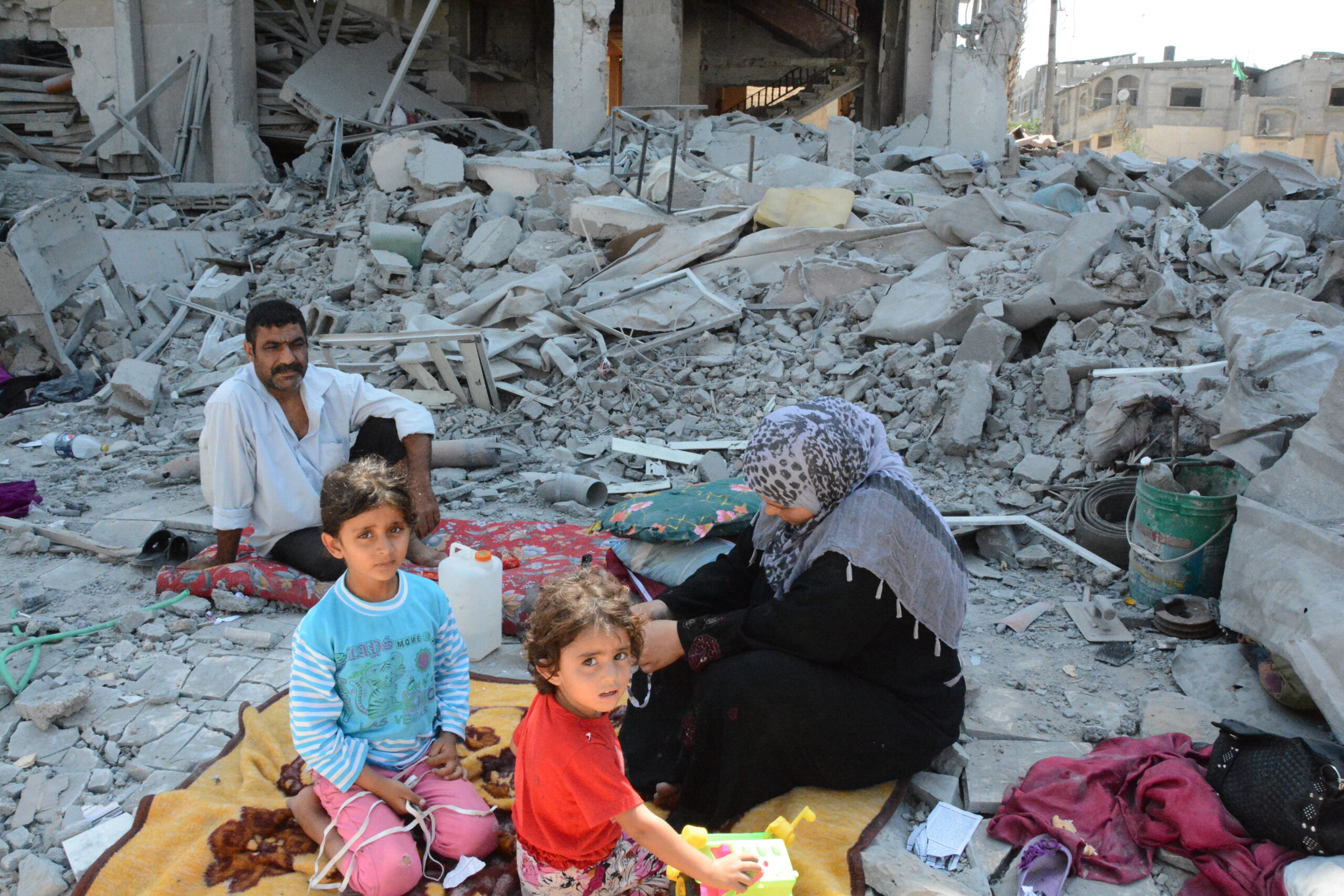 一家は住み家をイスラエル軍に破壊され悲嘆にくれていた。=2014年、ガザ 撮影:田中龍作=