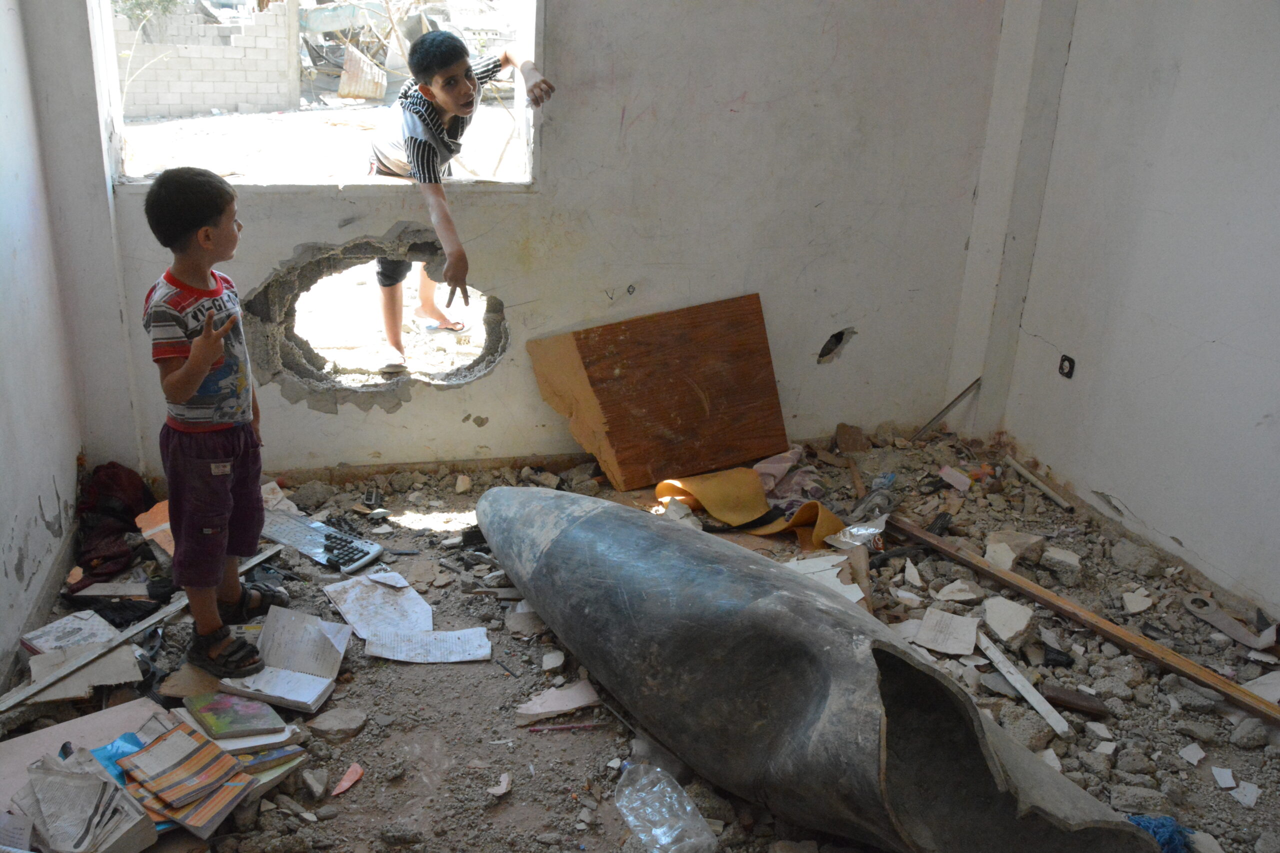 ミサイルの破片が子どもの遊び道具になる現実がある。=2014年、ガザ 撮影:田中龍作=