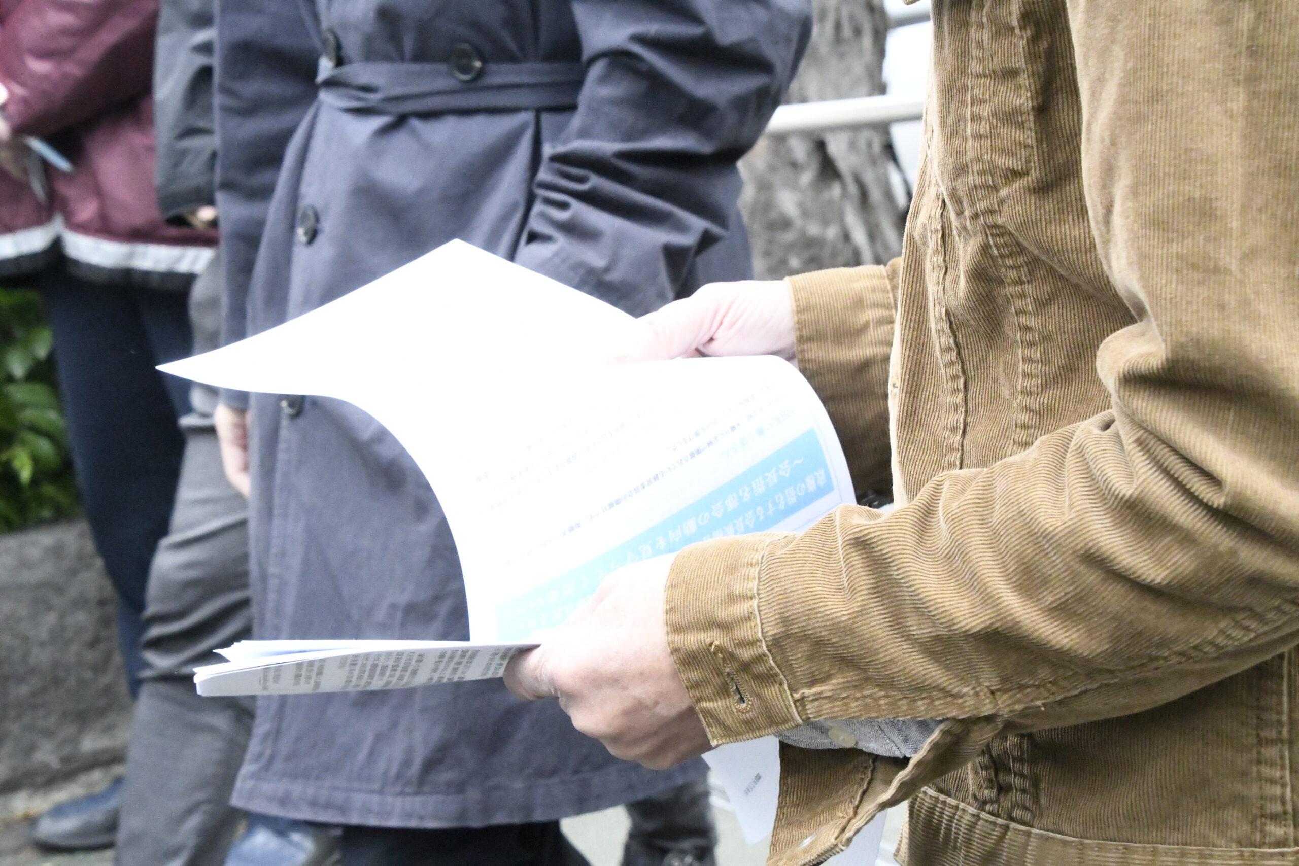 昼食に出かけるNHK職員らに「会長人事の透明性を求める」チラシを配った。=11日、NHK西口 撮影:田中龍作=