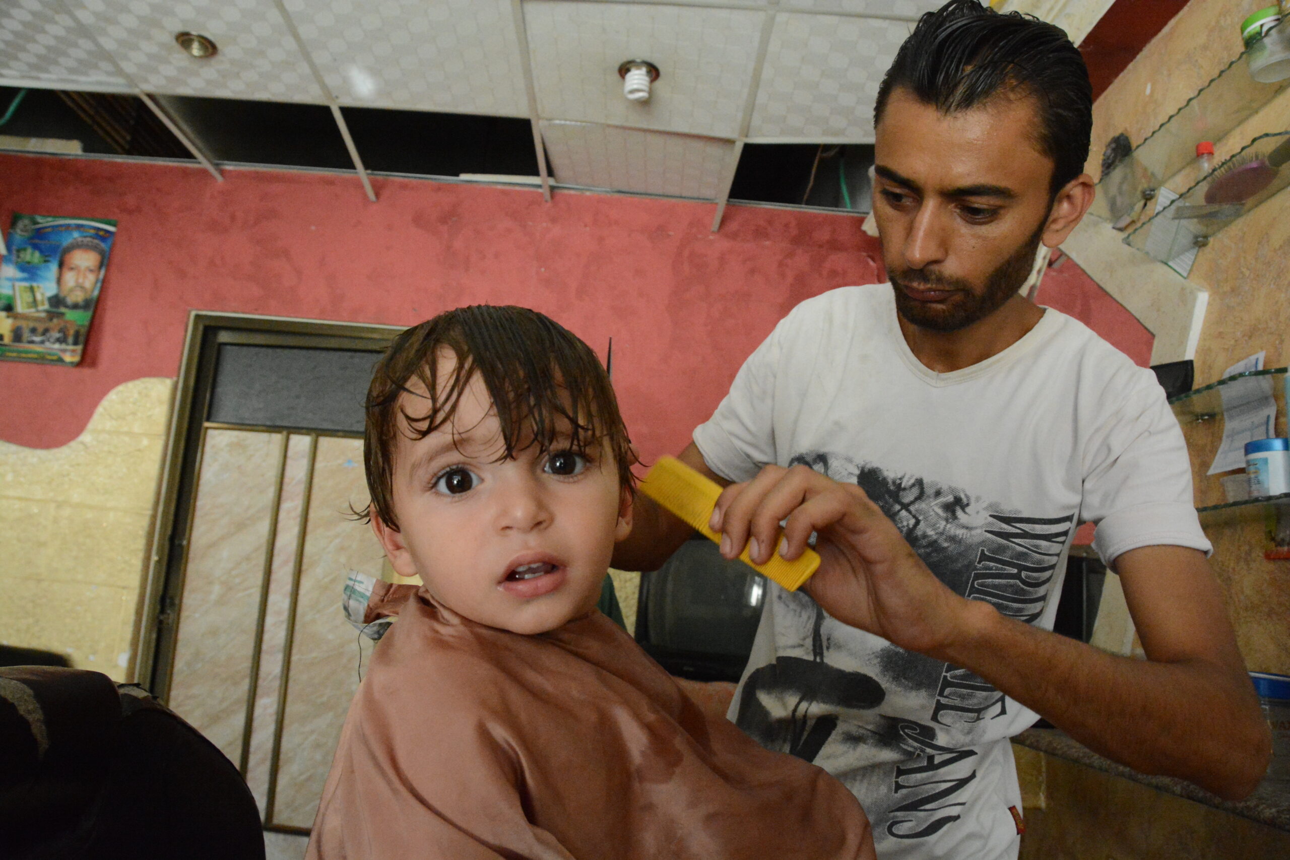 =2014年、ガザ。爆撃の合間を縫って散髪する子供。怯えた目が今でも忘れられない。撮影:田中龍作=