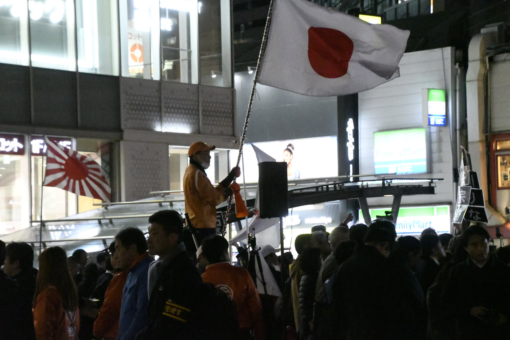 高市首相にとって心強い同志たちの街宣会場には日章旗と旭日旗がはためいた。